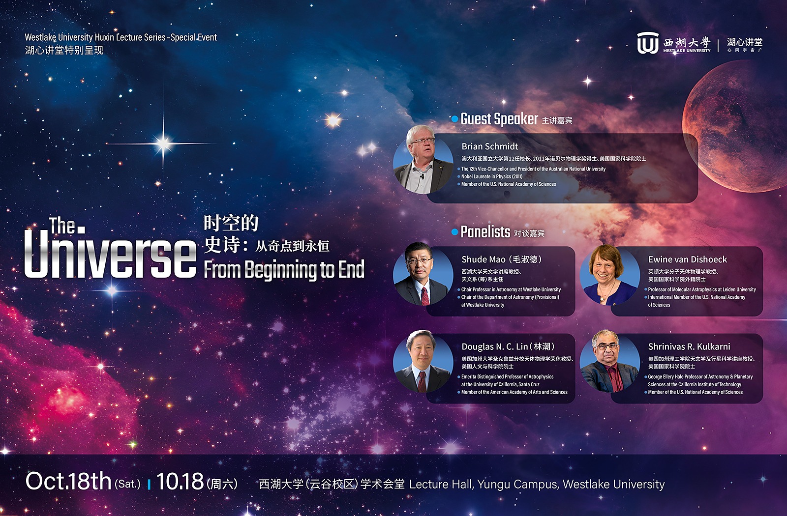 西湖大学湖心讲堂特别呈现《时空的史诗:从奇点到永恒》将于10月18日在西湖大学(云谷校区)学术会堂举行。这次将带领我们一同驶入星空的重磅嘉宾是布莱恩·施密特(Brian P. Schmidt),澳大利亚国立大学第12任校长、2011年诺贝尔物理学奖得主、美国国家科学院院士。在随后的问答对谈环节,西湖大学理学院讲席教授毛淑德将领衔与来自全球的天文领域重量级学者(Ewine van Dishoeck, Douglas N. C. Lin, Shrinivas R. Kulkarni)共话时空的史诗与宇宙的未来。