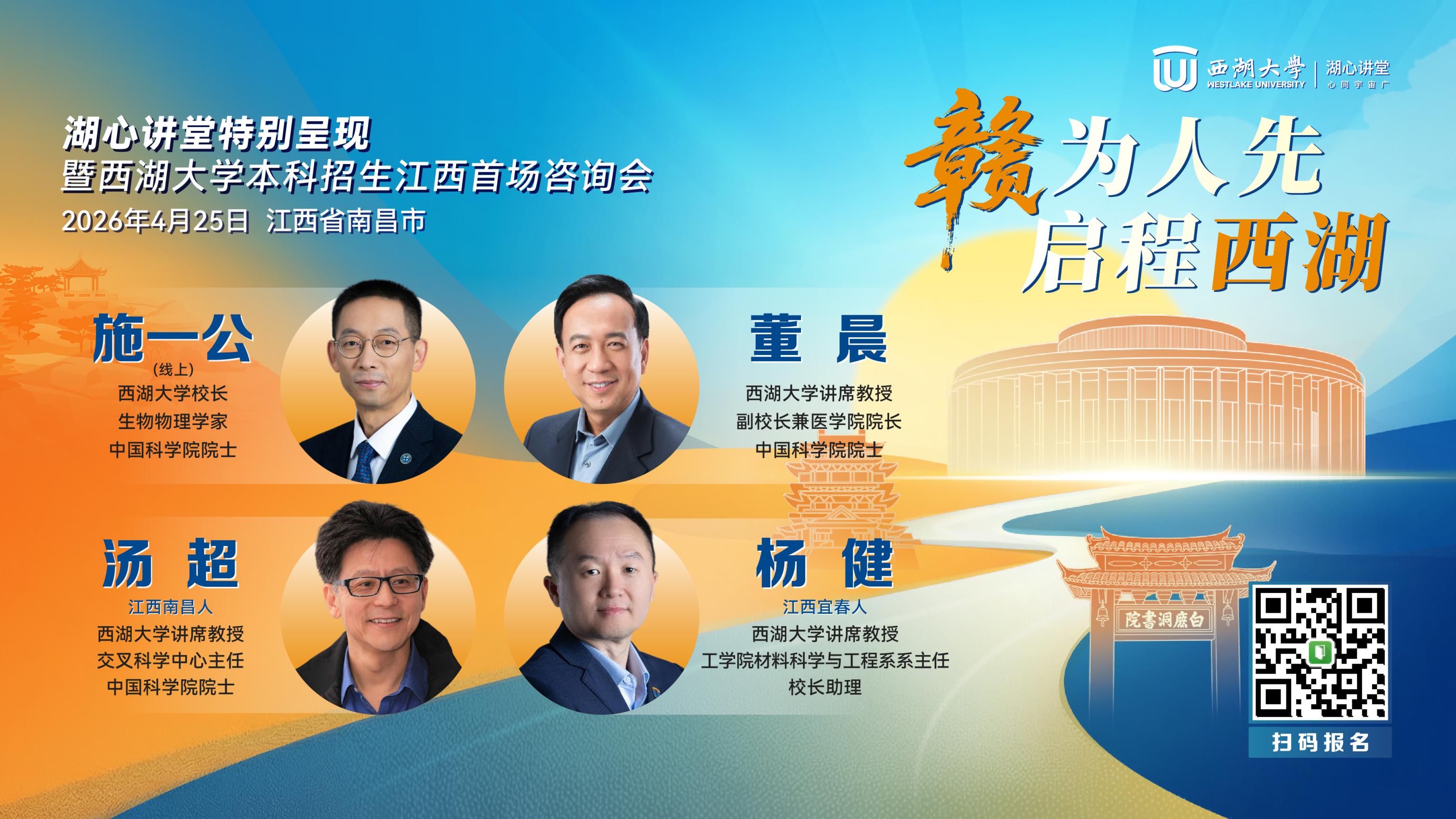 4月25日至26日,西湖大学将携顶尖教授团队先后走进南昌与合肥,带来两场“湖心讲堂特别呈现暨本科招生首场咨询会”。